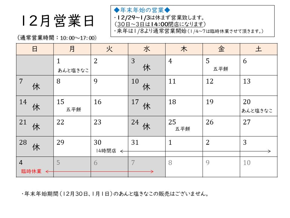 12月の営業日のお知らせ