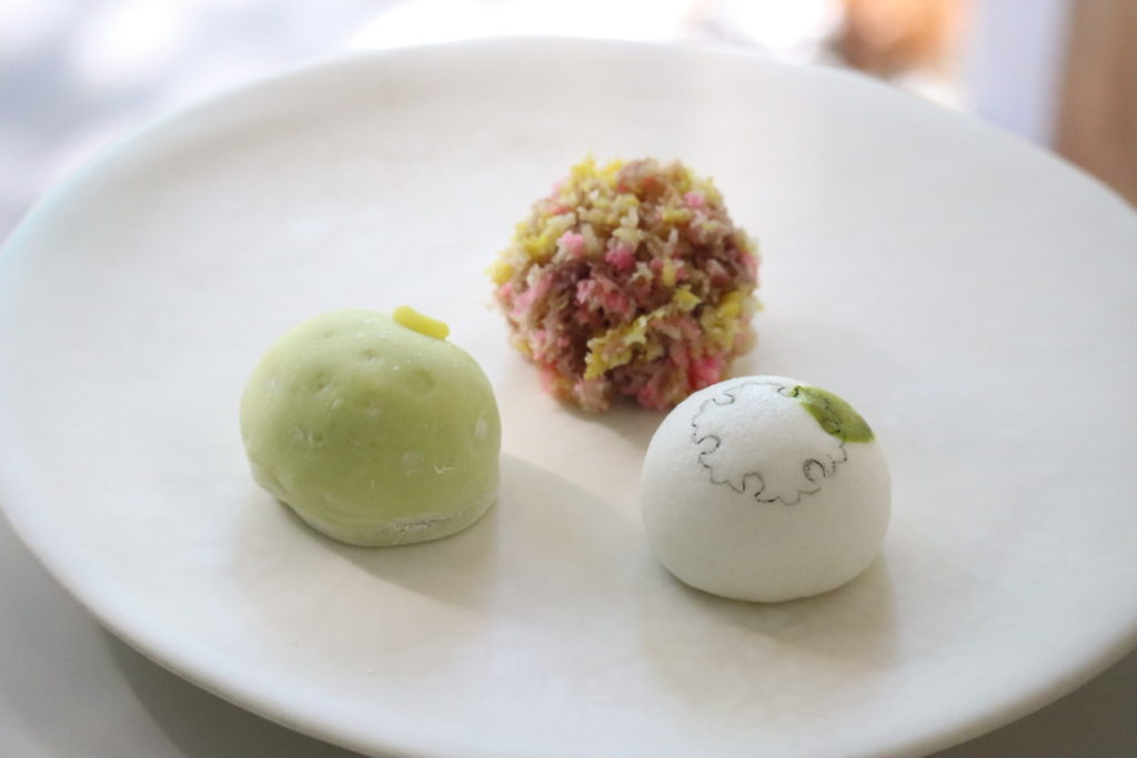 ふわふわの餅生地と柚子を添えた青いフルーティなお菓子です。