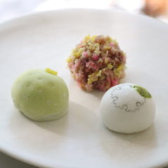 雛飾りの右近の橘、左近の桜をきんとんで表現しました。
